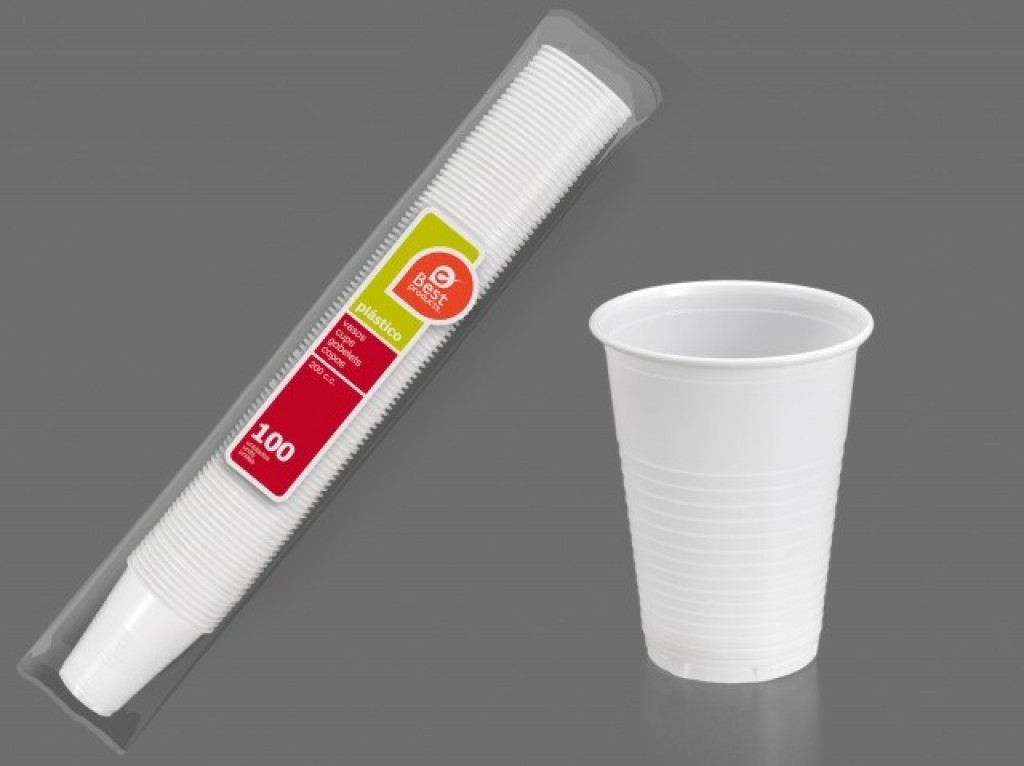 Bolsa de 100 vasos de 200 cc blancos de plástico reutilizables.